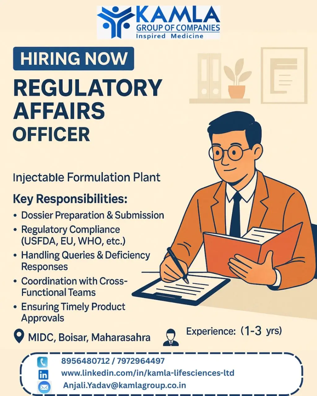 Kamla Group of Companies, a trusted name in pharmaceutical manufacturing, is looking for talented professionals to join its Injectable Formulation Plant in Boisar, Maharashtra. The company is hiring for the role of Regulatory Affairs Officer, a vital position responsible for ensuring compliance with global regulatory standards, dossier submissions, and product approvals.