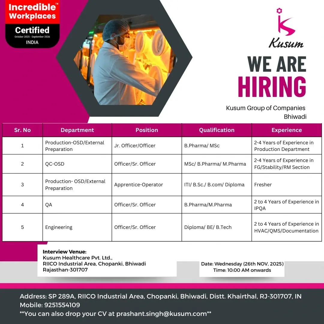 Kusum Healthcare hiring B.Pharma/M.Sc candidates for Production, QC, QA, Engineering roles in Bhiwadi. Multiple vacancies for freshers and 2–4 yrs exp.