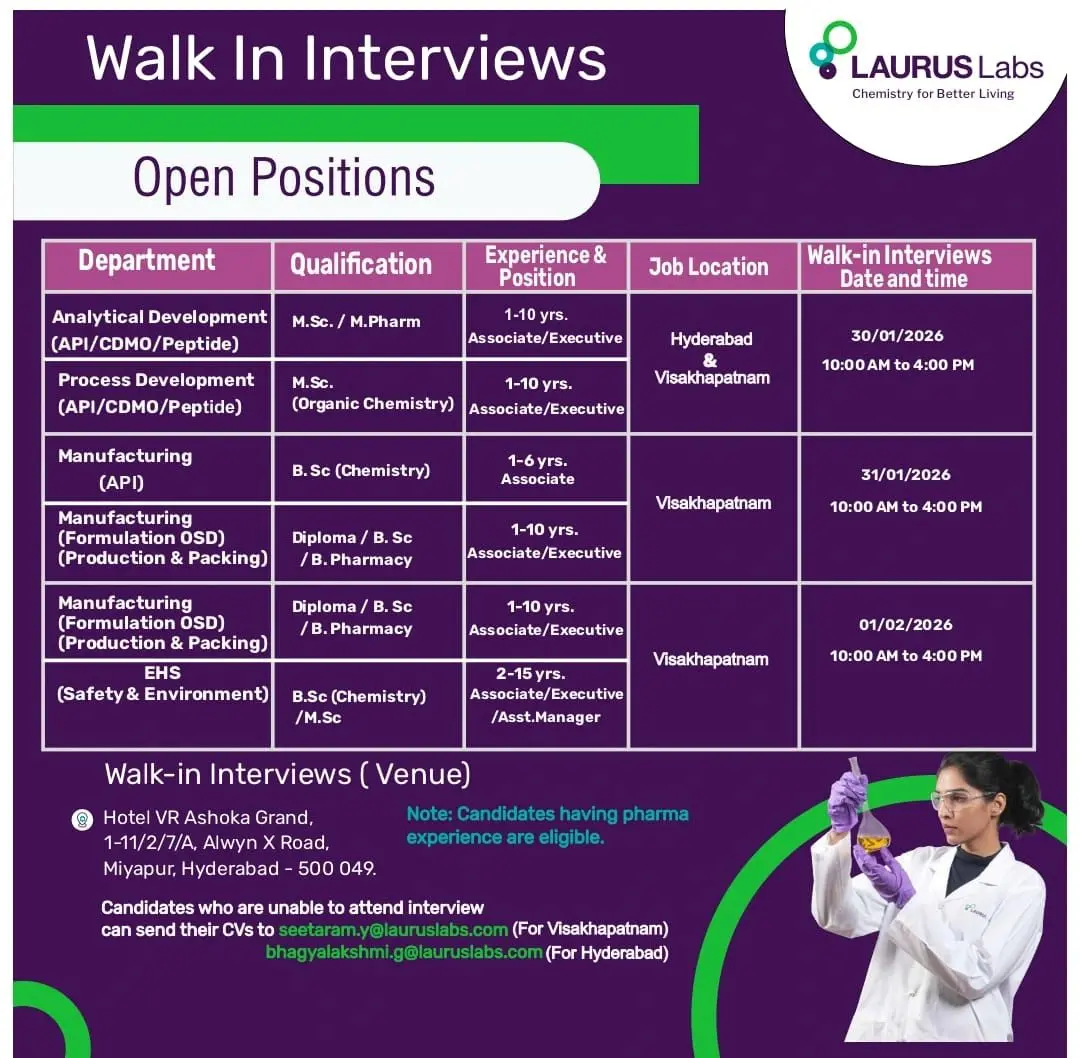 Laurus Labs, one of India’s leading pharmaceutical and CDMO companies, is conducting large-scale walk-in interviews for its API, Formulation, Analytical Development, Process Development, Manufacturing, and EHS departments. These walk-in drives are open for experienced pharma and chemistry professionals looking to build long-term careers in regulated pharmaceutical manufacturing and research environments. The interviews will be conducted across Visakhapatnam and Hyderabad locations on multiple dates, offering candidates flexibility and direct access to hiring teams.