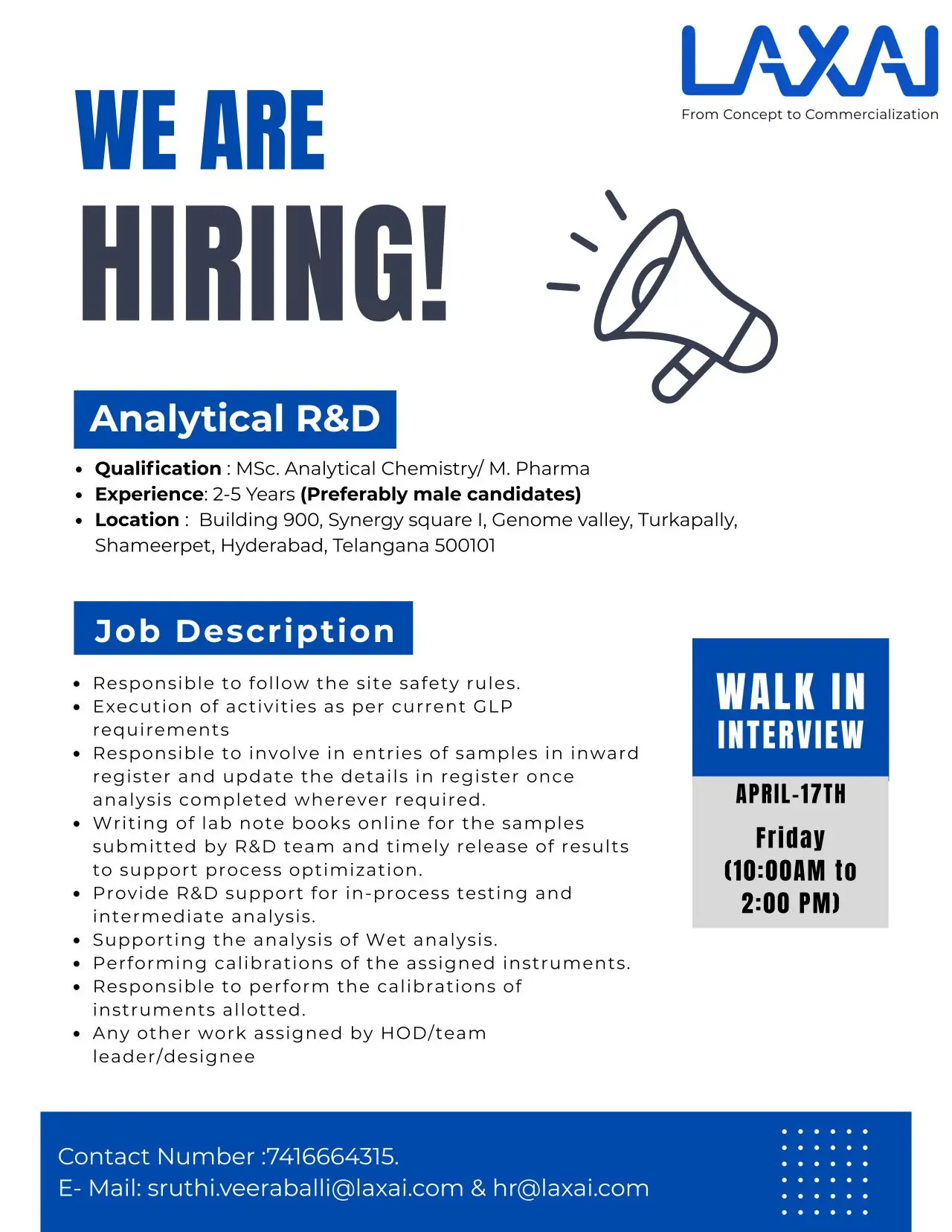 LAXAI hiring for Analytical R&D roles in Hyderabad. MSc, MPharm with 2–5 yrs experience eligible. Walk-in on April 17.