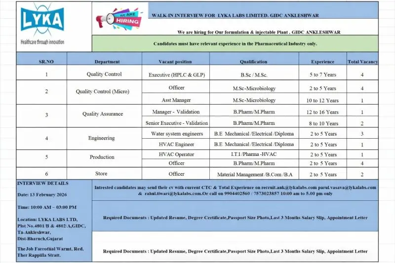 - LYKA Labs Limited Hiring Multiple Pharma Professionals in Ankleshwar – Walk-In Interview 2026