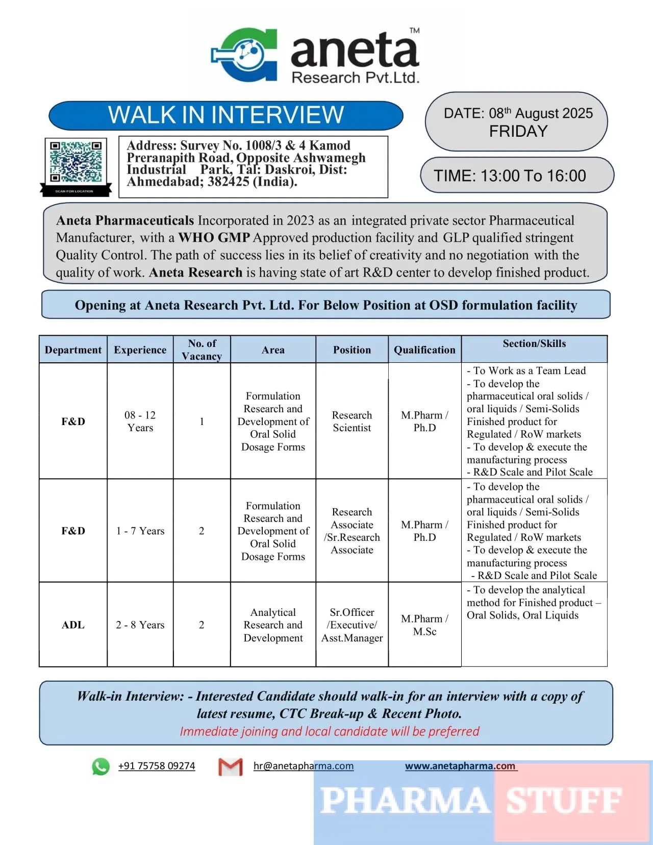 Aneta Research Pvt. Ltd., a WHO GMP-certified pharmaceutical company with a modern R&D infrastructure, is conducting a walk-in interview for multiple R&D roles at its Oral Solid Dosage (OSD) facility in Ahmedabad. Known for its commitment to quality, innovation, and global market reach, Aneta is inviting experienced professionals in Formulation and Analytical Development to join its expanding scientific team.