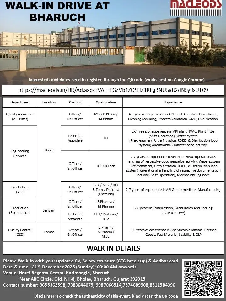 Macleods is conducting a large-scale walk-in drive in Bharuch for multiple openings across API and formulation units. These roles suit candidates with experience in quality assurance, quality control, production, and engineering services in regulated pharmaceutical manufacturing. The hiring covers vacancies at Dahej, Sarigam, and Daman locations.