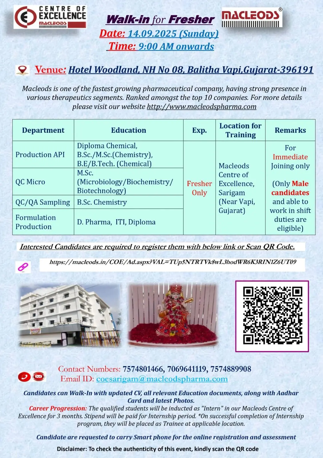 Macleods Fresher Walk-in – Chemistry, Pharmacy, Biotech – Vapi 2025