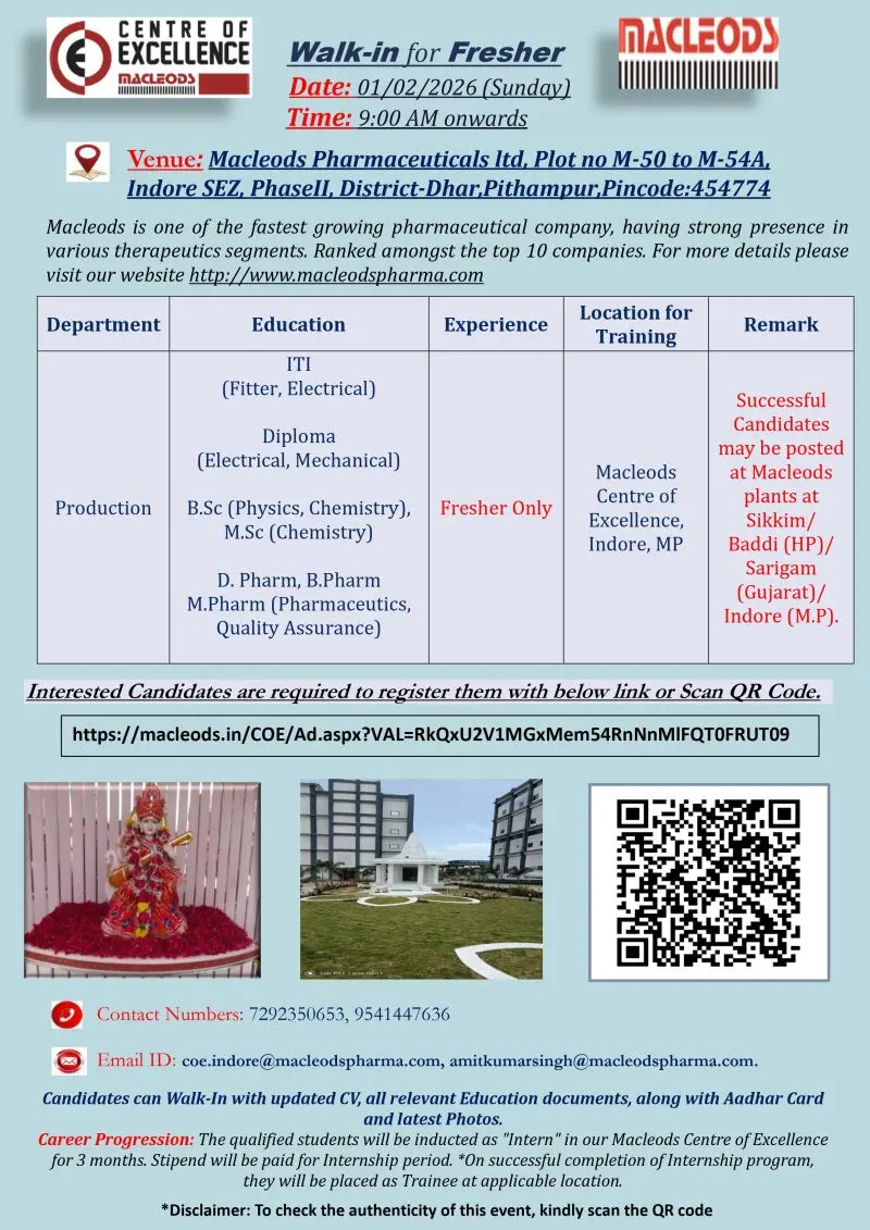 Macleods Pharmaceuticals has announced a large-scale walk-in opportunity for freshers at its Centre of Excellence in Indore. This hiring drive is designed for candidates who want structured industry training, real-time pharmaceutical manufacturing exposure, and a clear pathway into long-term roles within one of India’s top-ranked pharmaceutical companies. The program focuses on skill development, regulated plant exposure, and career stability for science, pharmacy, diploma, and ITI graduates.