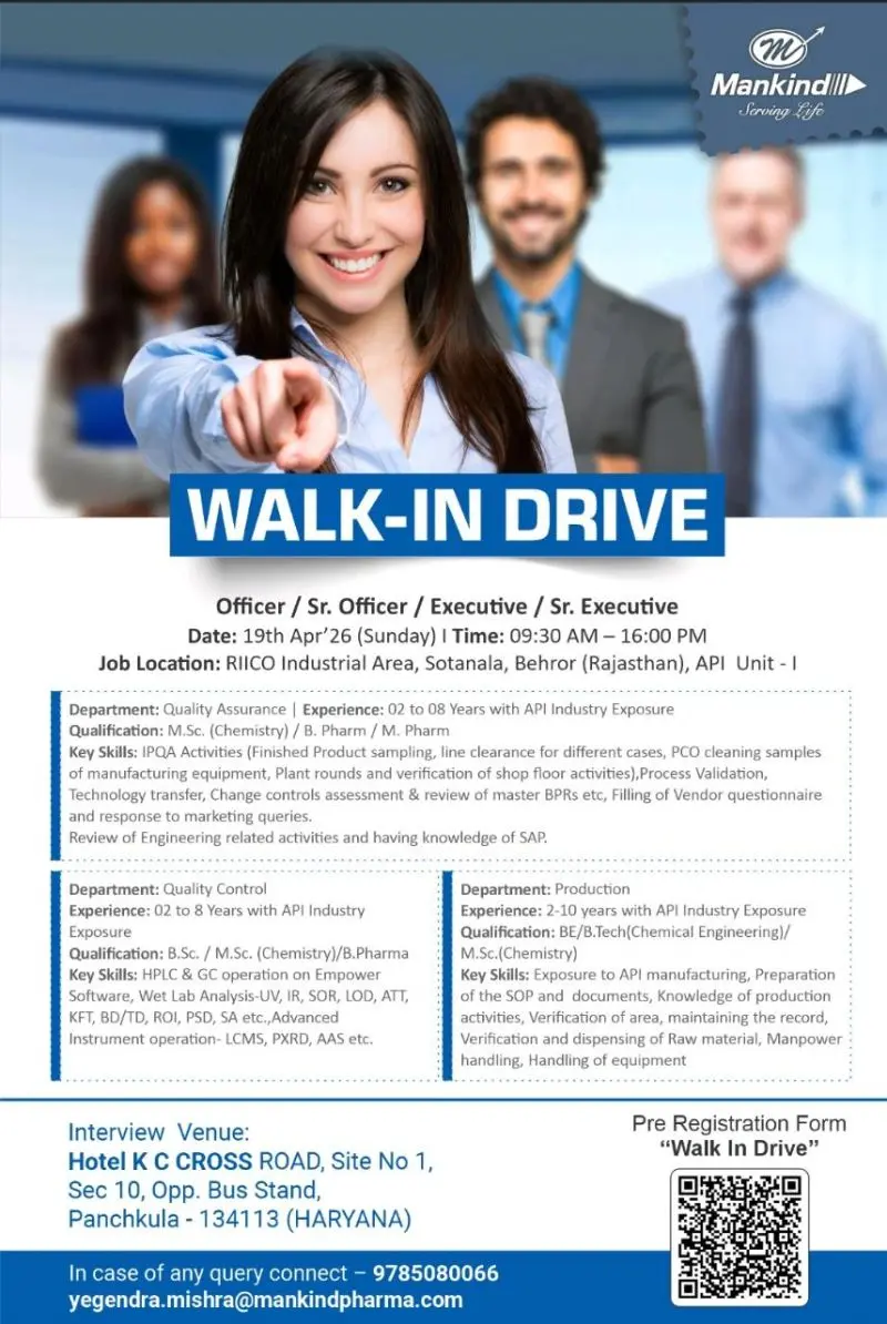 Mankind Pharma is conducting a walk-in drive for multiple vacancies across Quality Assurance, Quality Control, and Production departments at its API Unit in Behror, Rajasthan. The company is hiring experienced professionals for roles including Officer, Senior Officer, Executive, and Senior Executive, offering strong career growth opportunities in pharmaceutical manufacturing and API production.