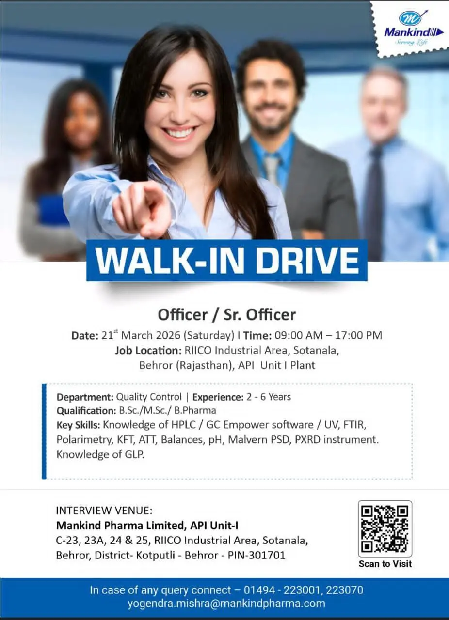 - Mankind Pharma Walk-in Drive 2026 | QC Officer Jobs in Rajasthan for BPharm MSc Candidates