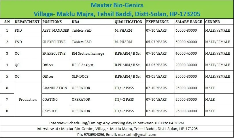 Explore multiple job vacancies at Maxtar Bio-Genics, Baddi for M. Pharm, B. Pharm, BSc, and ITI pass-outs in QC, F&D, and Production departments. Immediate interview opportunity available