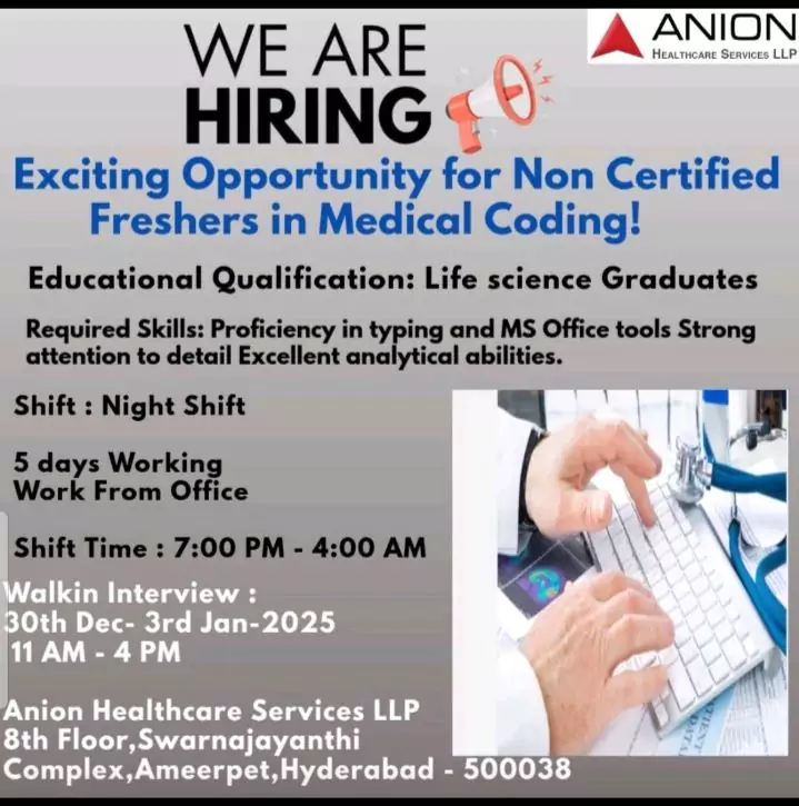 Are you a fresh graduate in Life Sciences with a passion for healthcare information management? Anion Healthcare Services LLP is conducting a Medical Coding Fresher Recruitment Drive at its Hyderabad office. This is a golden opportunity for non-certified freshers to step into the field of medical coding with extensive training and support.