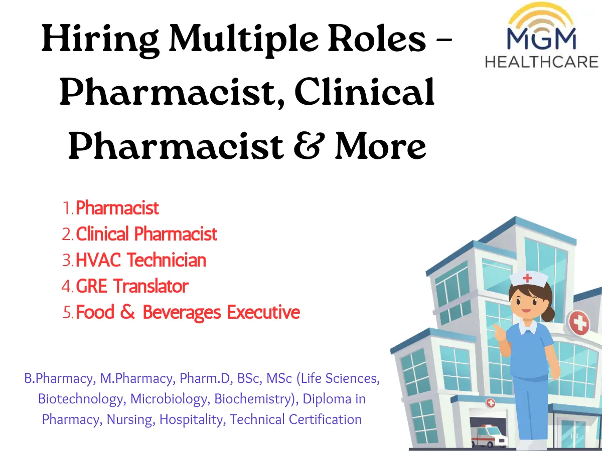 MGM Healthcare Group is hiring for multiple vacancies across departments including Pharmacy, Pharmacology, OP Services, Maintenance, and Food & Beverages in Chennai. Open positions include Pharmacist (2–3 years experience), Clinical Pharmacist (0–3 years), GRE Translator (0–3 years), HVAC Technician (2 years), and Food & Beverages Executive (0–1 year). This is a strong opportunity for freshers and experienced candidates to join a reputed hospital network known for clinical excellence and advanced healthcare infrastructure.