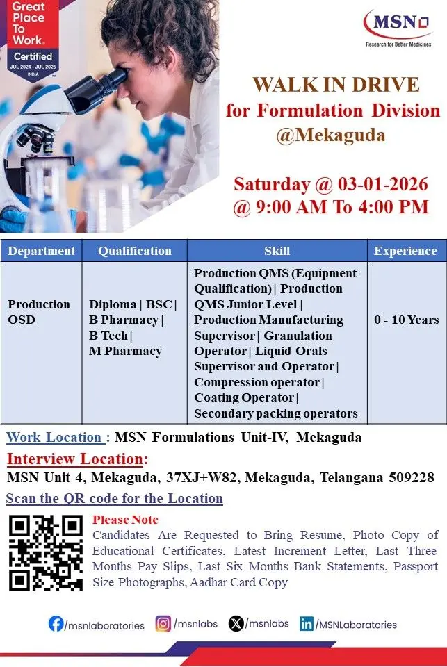 This opportunity is ideal for candidates searching for pharma walk-in interviews in Telangana, production OSD jobs, granulation operator roles, compression and coating operator positions, and formulation manufacturing jobs in regulated pharma plants. MSN Formulations offers a stable, growth-oriented work culture and is certified as a Great Place to Work for the period July 2024 to July 2025.