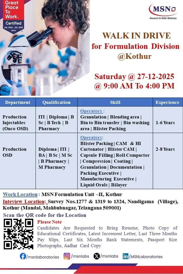 MSN Laboratories, a Great Place to Work–certified pharmaceutical organization, is conducting a large-scale walk-in drive for its Formulation Division at Chinna Chilkamarri and Kothur units in Telangana. This hiring drive is specifically designed for fresh graduates and experienced operators who are looking to build long-term careers in injectable and oral solid dosage (OSD) manufacturing within a globally regulated pharmaceutical environment.