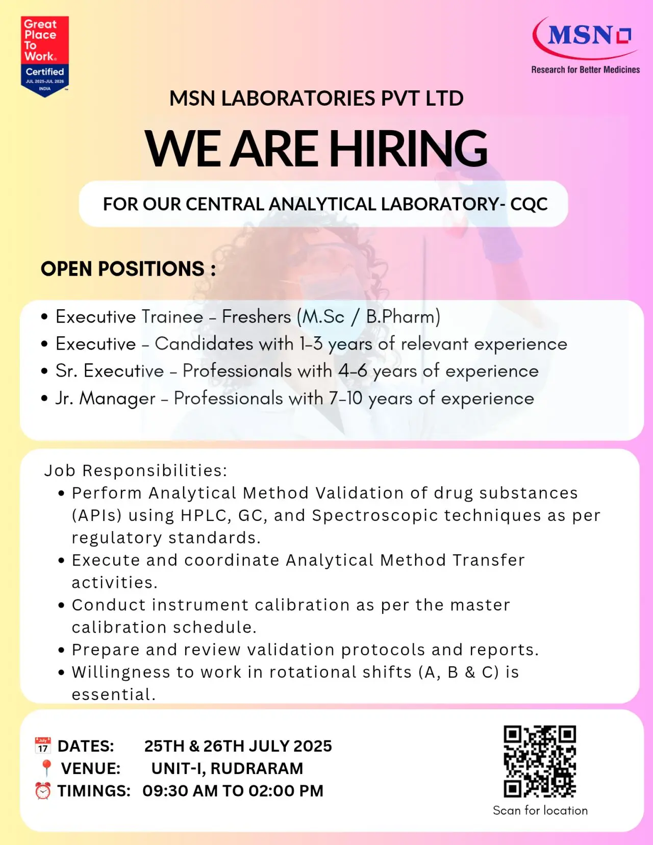MSN Laboratories Pvt. Ltd, a renowned name in the pharmaceutical industry and a certified Great Place to Work, is hiring across multiple levels for its Central Analytical Laboratory (CQC) unit. Located at Rudraram, Telangana, these opportunities are open to both fresh graduates and experienced candidates who are passionate about analytical research and drug development.