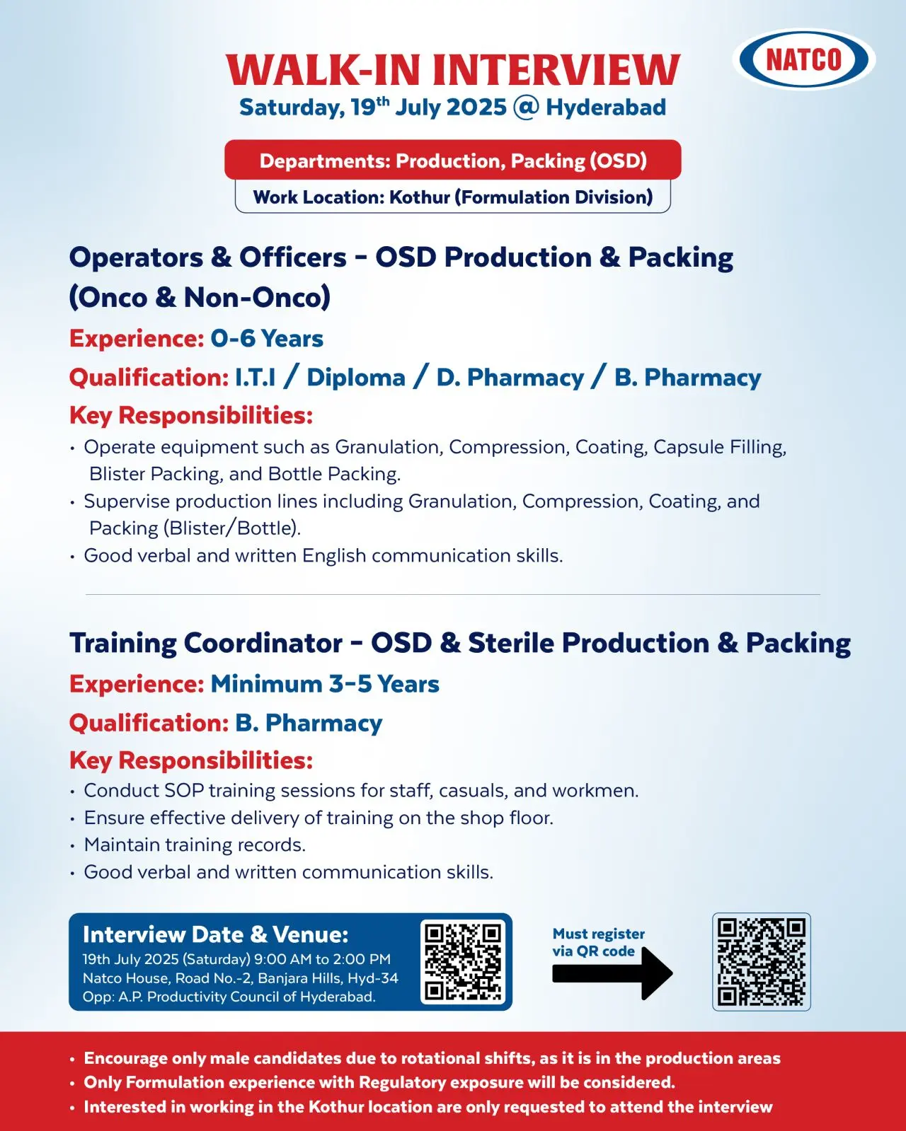 - Walk-In Interviews at Natco Pharma – OSD Production & Packing Jobs in Hyderabad