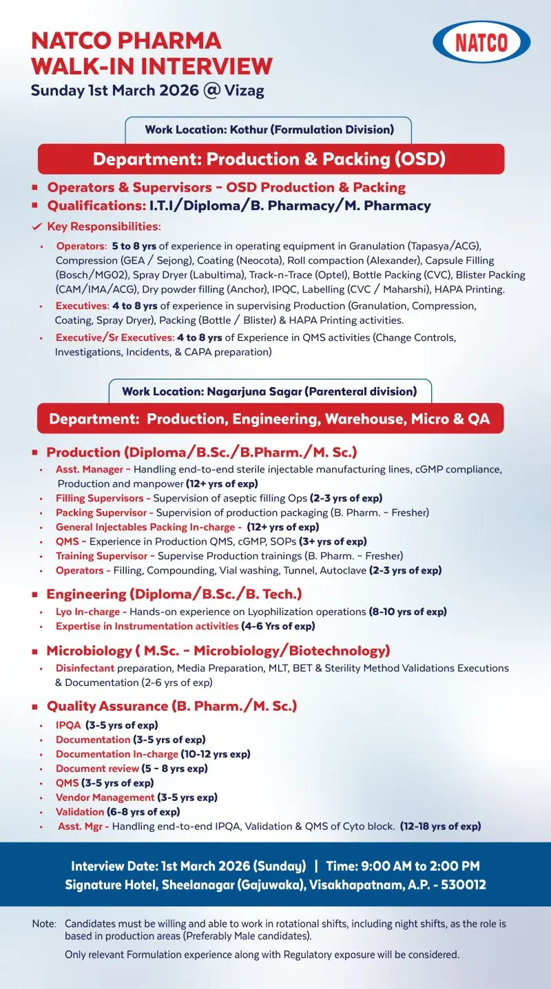 Natco Pharma is conducting a Mega Walk-In Interview on 1st March 2026 (Sunday) in Visakhapatnam for multiple vacancies across Production, Packing, Quality Assurance, Microbiology, Engineering, Warehouse, and QMS departments. Opportunities are available at two major manufacturing locations – Kothur (Formulation – OSD Division) and Nagarjuna Sagar (Parenteral – Sterile Injectables Division).