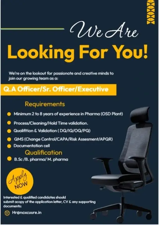 Naxcuure hiring QA Officers/Sr. Officers/Executives with 2–8 yrs experience in OSD Pharma. BSc, B Pharm, M.Pharm candidates can apply now.