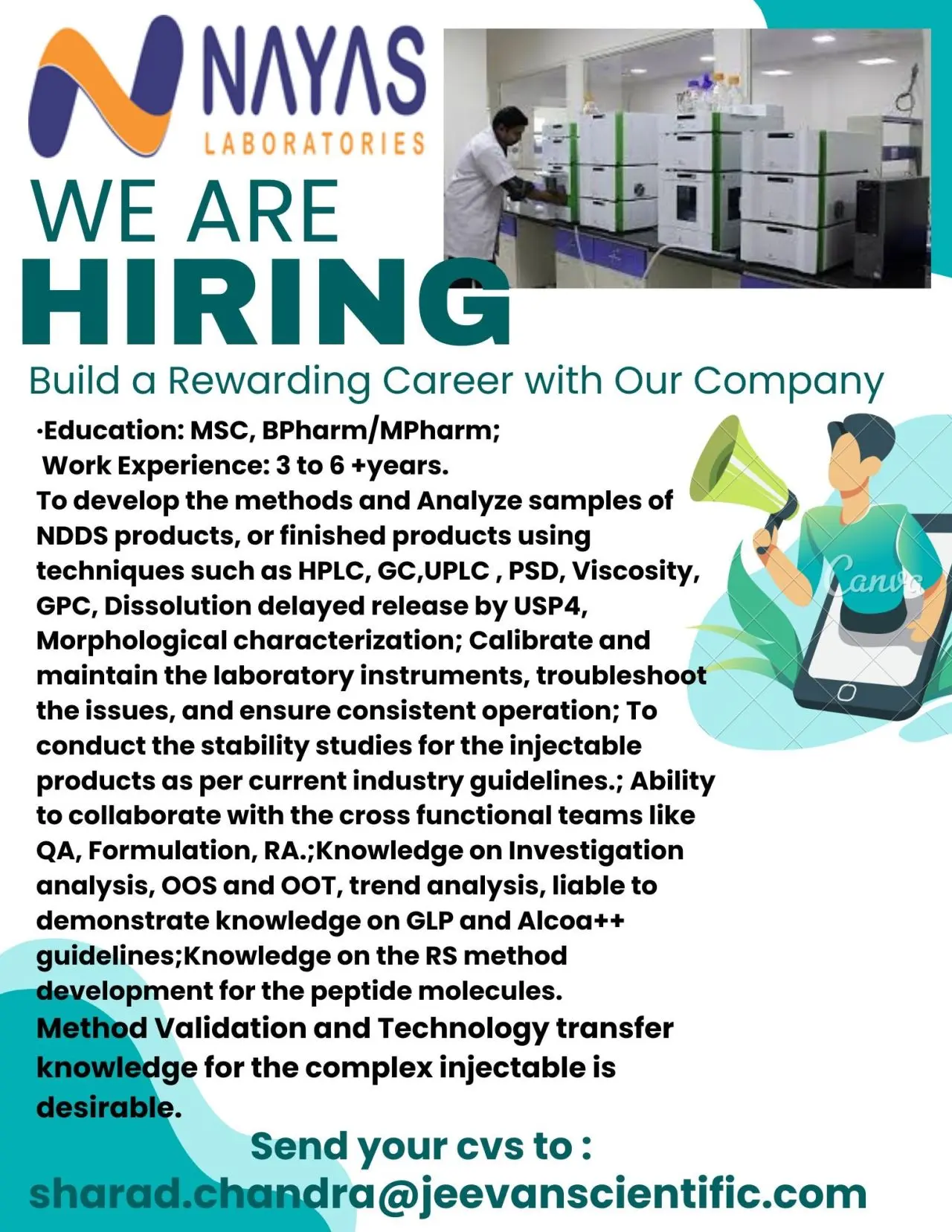 Nayas Laboratories hiring MSC, BPharm, MPharm graduates with 3–6+ years’ experience in analytical R&D for NDDS and injectables.