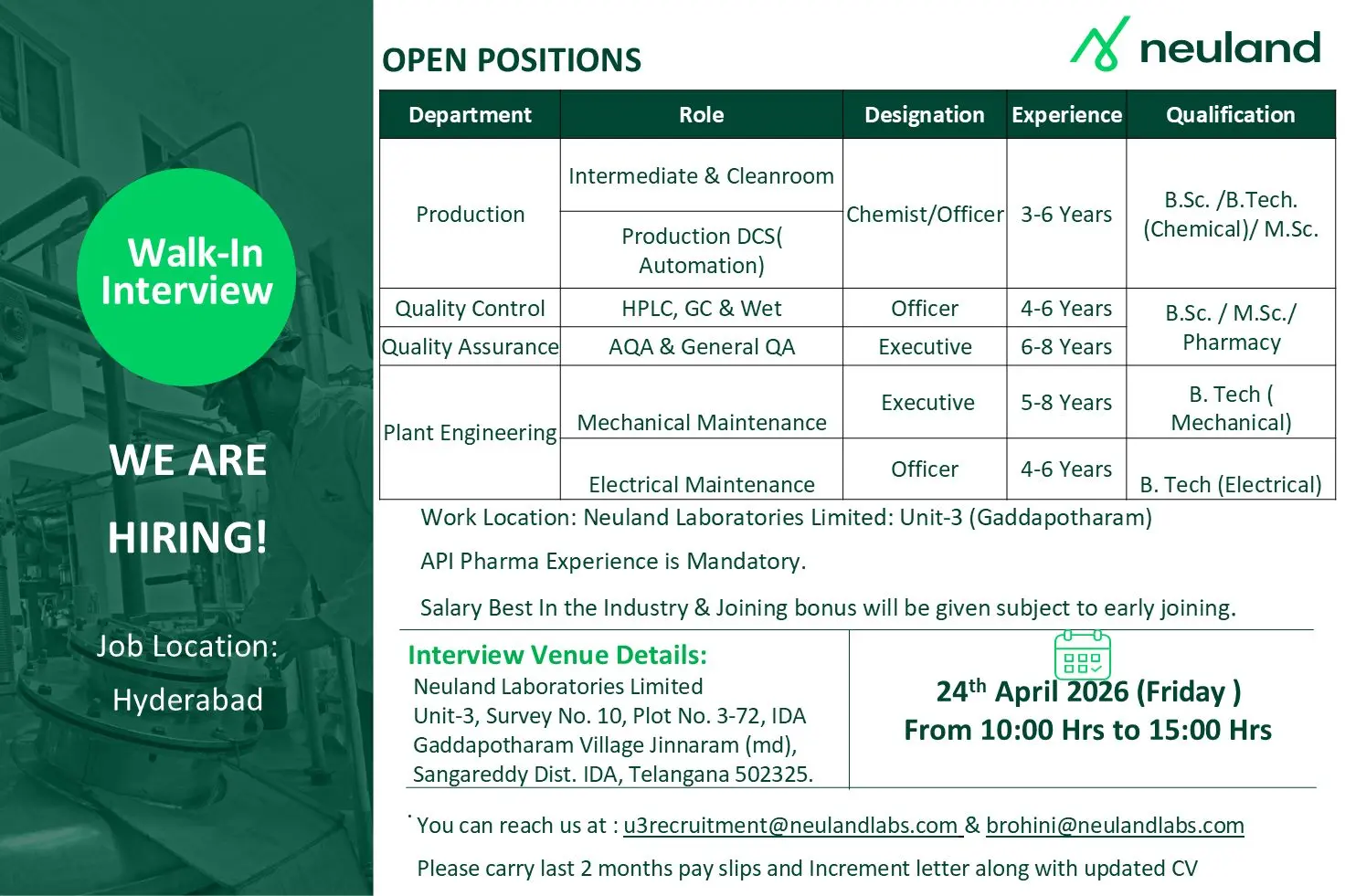 Neuland Laboratories Limited is conducting a walk-in interview for multiple roles across Production, Quality Control, Quality Assurance, and Plant Engineering departments. If you are looking for high-paying pharma jobs in Hyderabad, API manufacturing careers, or GMP-regulated pharma industry opportunities, this is a strong opportunity to advance your career.