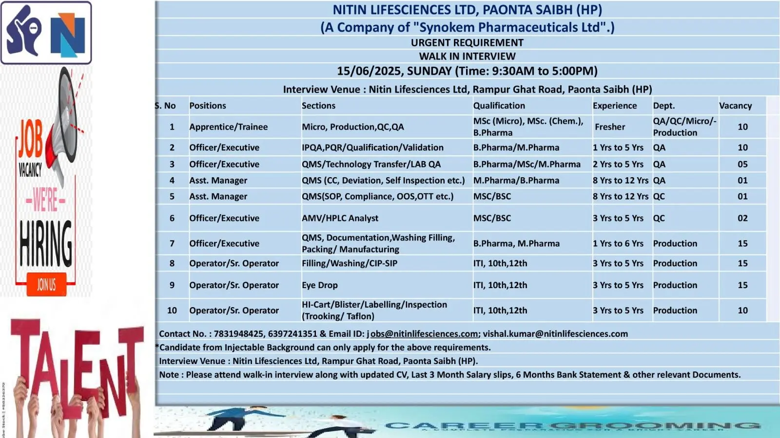 Nitin Lifesciences Ltd., a reputed injectable pharmaceutical manufacturing company and a unit of Synokem Pharmaceuticals Ltd., is conducting a mega walk-in interview drive on 15th June 2025 at its facility in Paonta Sahib, Himachal Pradesh.