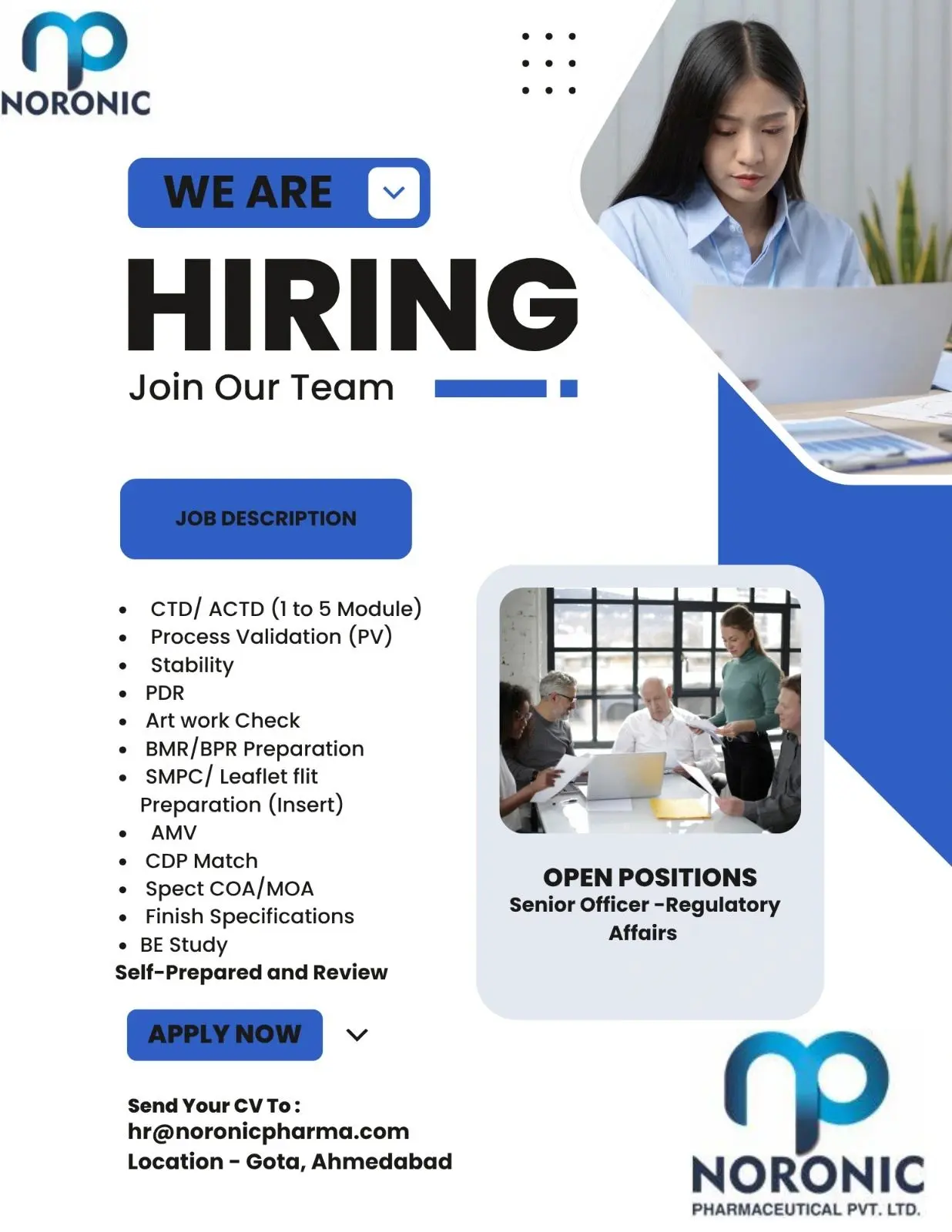 Apply for Senior Officer – Regulatory Affairs at Noronic Pharma, Ahmedabad. 3–7 yrs exp. CTD/ACTD, PV, Stability, BMR/BPR, Artwork & BE Study.