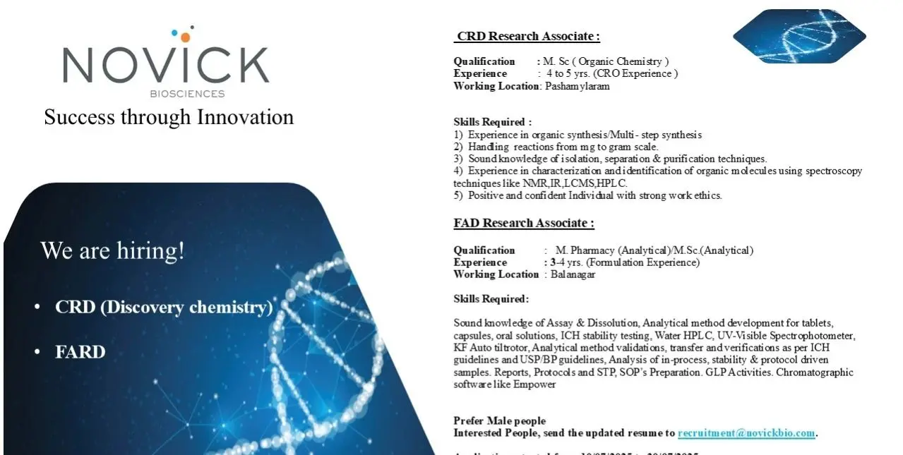 - Novick Biosciences Hiring Research Associates – CRD & FARD | Hyderabad Locations