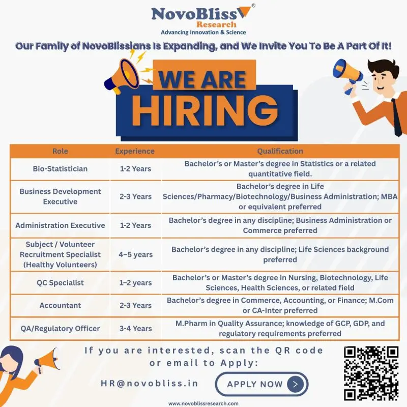 NovoBliss Research hiring Biostatistics, QA, BD & QC professionals. Life Sciences graduates with 1–5 yrs experience.