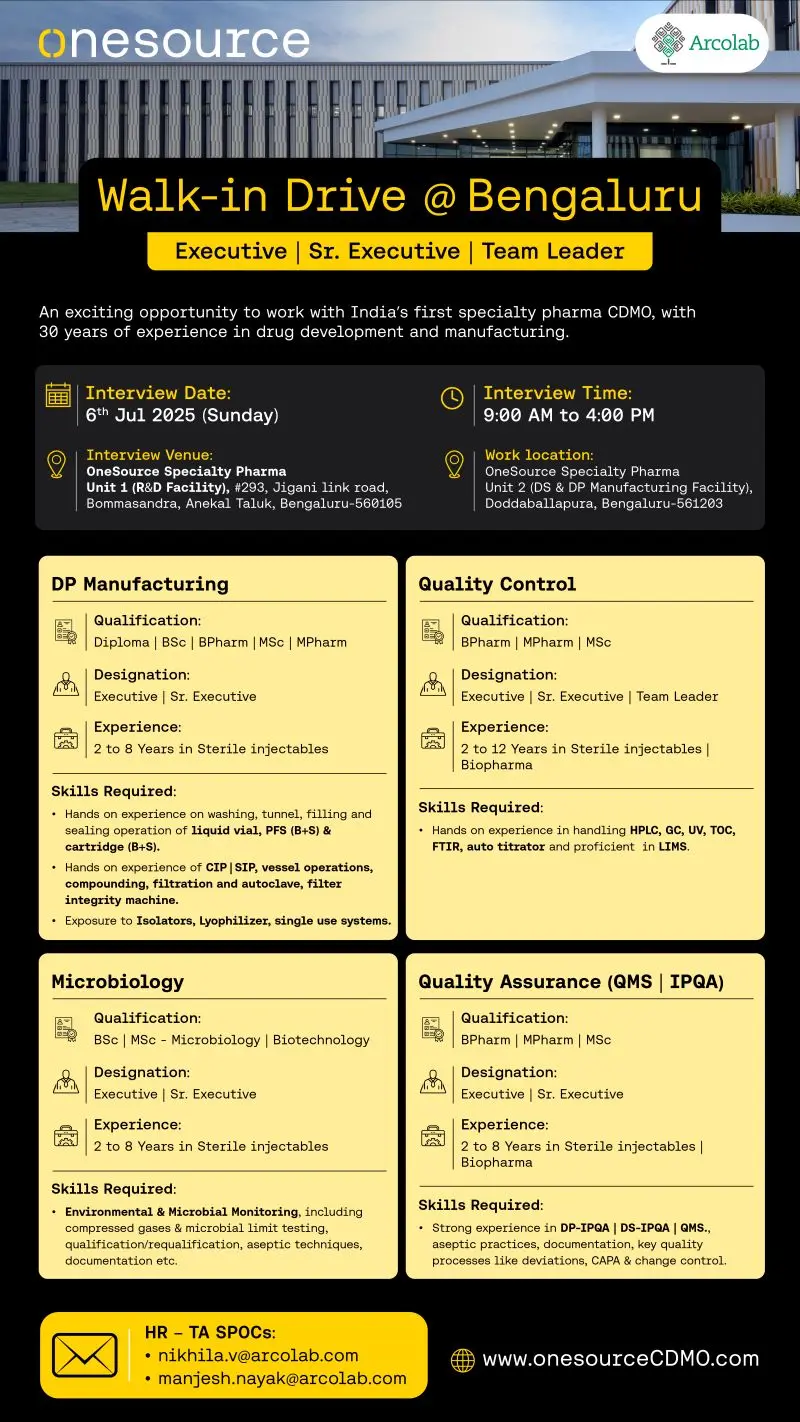 OneSource Arcolab hiring for multiple roles in QC, QA, Microbiology, and DP Manufacturing at Bengaluru. Walk-in on 6th July 2025. 2-12 years experience required.