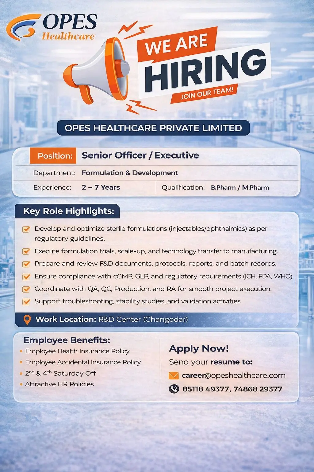 OPES Healthcare Private Limited is expanding its Research and Development operations and inviting applications from experienced pharmaceutical professionals for Formulation & Development roles at its Changodar R&D Center. This opportunity is ideal for candidates with hands-on exposure to sterile formulation development who want to work in a compliance-driven R&D environment focused on innovation, quality, and patient safety. Professionals with experience in injectables and ophthalmic formulations will find this role highly rewarding for long-term career growth in pharmaceutical research and development.