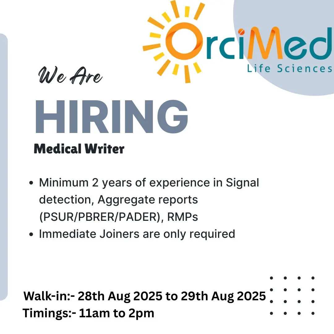 OrciMed Life Sciences is hiring Medical Writers with proven expertise in signal detection, aggregate reports, and regulatory submissions. This is an excellent opportunity for professionals with at least 2 years of experience in pharmacovigilance and regulatory writing to join a fast-growing life sciences organization. Immediate joiners are preferred, and a walk-in drive is scheduled for 28th–29th August 2025 in Hyderabad.