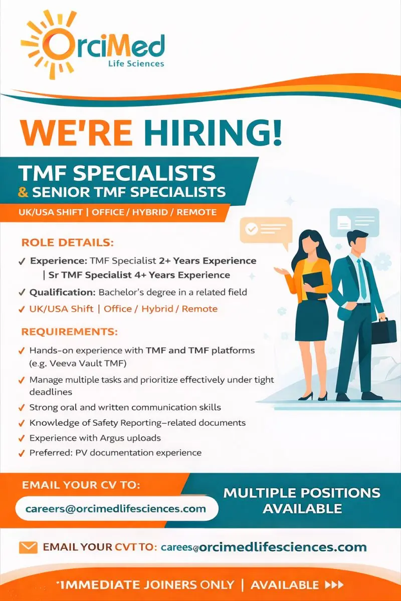 OrciMed Life Sciences Private Limited is hiring for multiple TMF Specialist and Senior TMF Specialist positions within its TMF, Clinical Research Operations, and BioMetrics functions. Several vacancies are available for TMF Specialists suitable for early-career professionals with 2+ years of experience, along with Senior TMF Specialist roles for candidates with 4+ years of experience. These roles are open for UK and USA shifts with flexible working models including office-based, hybrid, and remote options. The openings are ideal for candidates seeking stable, compliance-driven careers in clinical research documentation and regulatory operations.