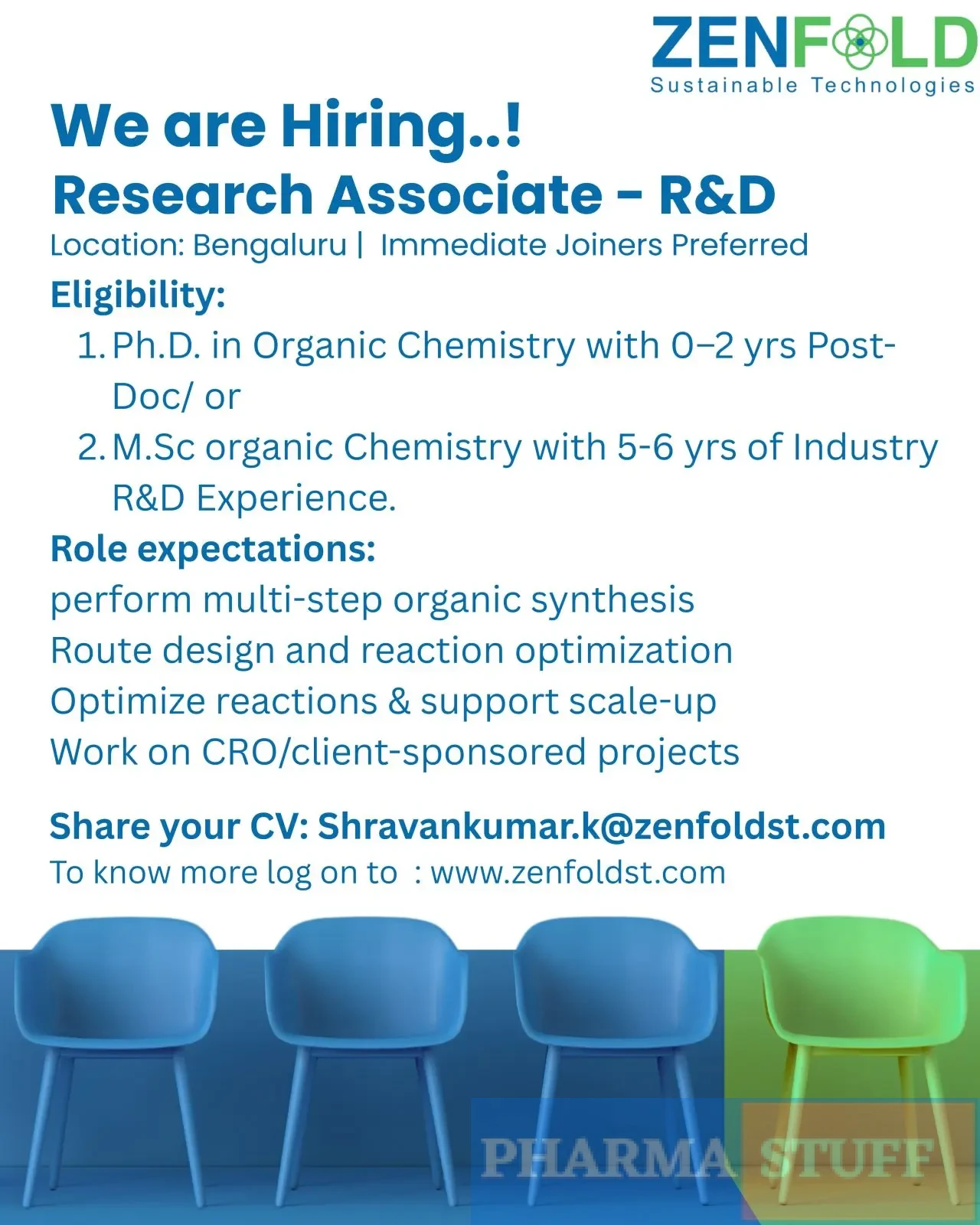 Apply for Research Associate R&D role at Zenfold Technologies, Bengaluru. PhD/MSc Organic Chemistry, 0-6 yrs experience. Immediate joiners.