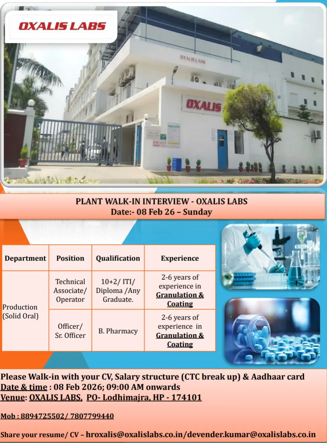 Oxalis Labs is conducting a plant-level walk-in interview for experienced pharmaceutical manufacturing professionals in its Solid Oral Dosage (OSD) production facility. This hiring drive is aimed at strengthening the granulation and coating operations with skilled operators and officers who understand GMP-driven pharma manufacturing environments. Candidates with hands-on exposure to production equipment and compliance-focused operations will find this opportunity aligned with long-term career growth in the API and formulation industry.