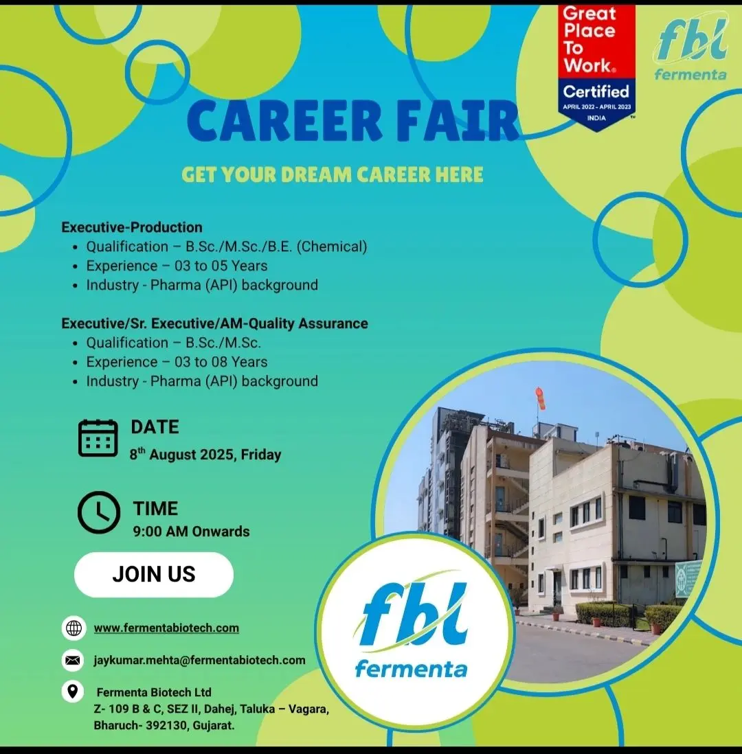 Are you looking to take the next step in your pharmaceutical API career? Fermenta Biotech Ltd., a Great Place To Work-Certified organization, is inviting talented professionals to its Career Fair on 8th August 2025 in Dahej, Gujarat for multiple openings in Production and Quality Assurance departments.
