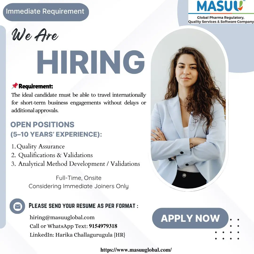 MASUU Global is hiring B Pharm/M.Pharm candidates with 5–10 years experience in QA, Validation, and Analytical Method Development. Full-time onsite roles. Apply now!