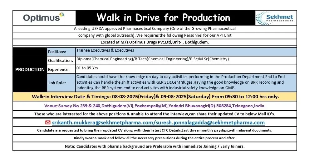 Sekhmet Pharmaceuticals, a USFDA-approved and rapidly growing pharmaceutical company with a global footprint, is inviting candidates for multiple walk-in interviews at their API Unit – Optimus Drugs Pvt. Ltd, Unit-I, located in Dothigudem, Telangana.