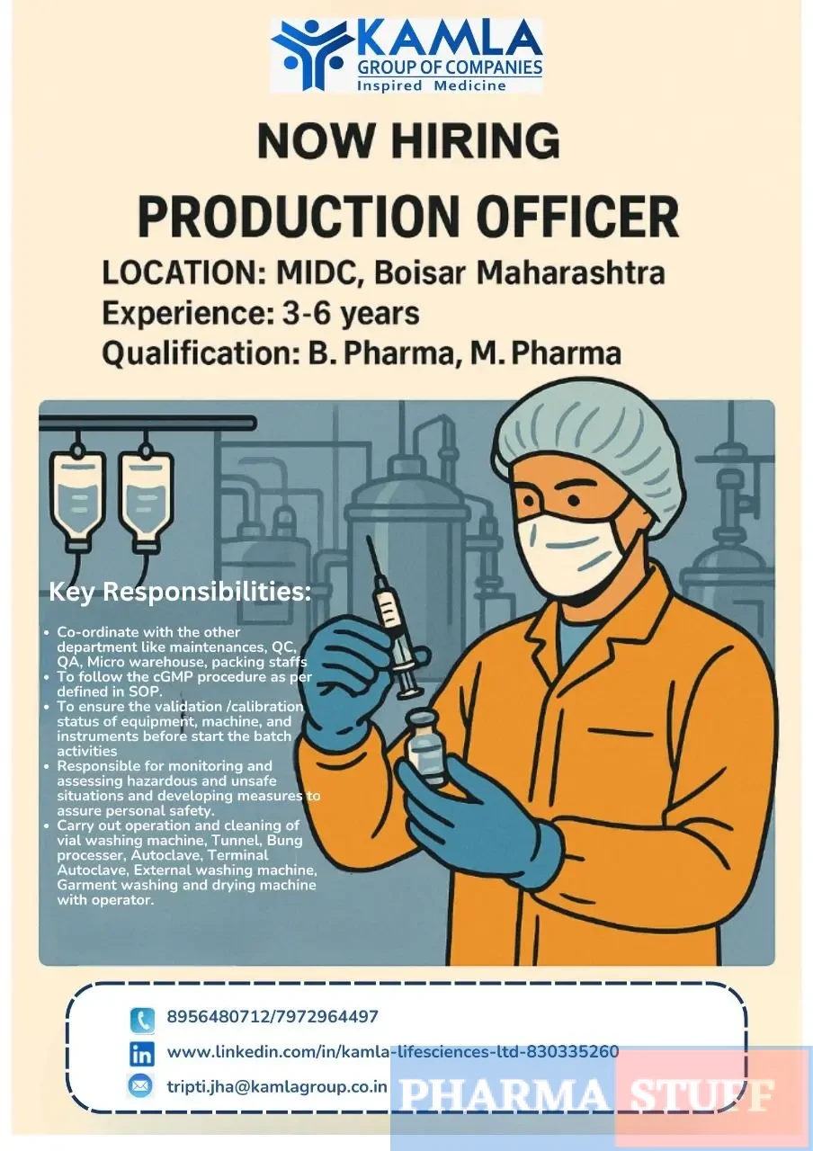 Kamla Group is hiring BPharma/MPharma professionals with 3–6 years’ experience for Production Officer roles in Boisar, MIDC, Maharashtra. Immediate openings available.