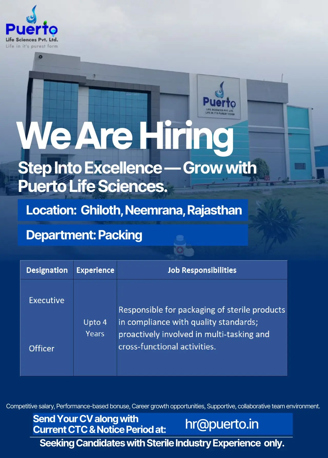 Puerto Life Sciences hiring Packing Executive & Officer at Ghiloth, Rajasthan. Sterile pharma packaging roles for experienced professionals.