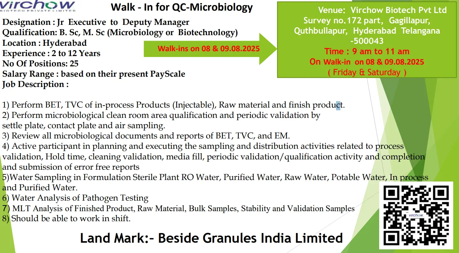 If you have a BSc or MSc in Microbiology or Biotechnology and are seeking career growth in QC Microbiology, this is your opportunity. Virchow Tech, a trusted name in the pharmaceutical and biotech industry, is conducting a walk-in drive to fill 25 QC Microbiology roles from Junior Executive to Deputy Manager levels. These roles are based in Hyderabad, offering long-term career prospects in sterile formulation manufacturing.