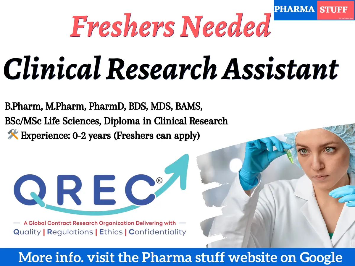 | QREC Clinical Research LLP | Clinical Research Assistant | B Pharm, M.Pharm, PharmD, BDS, MDS, BAMS, BSc/MSc/Diploma in Clinical Research, Life Sciences | Freshers & Experienced |