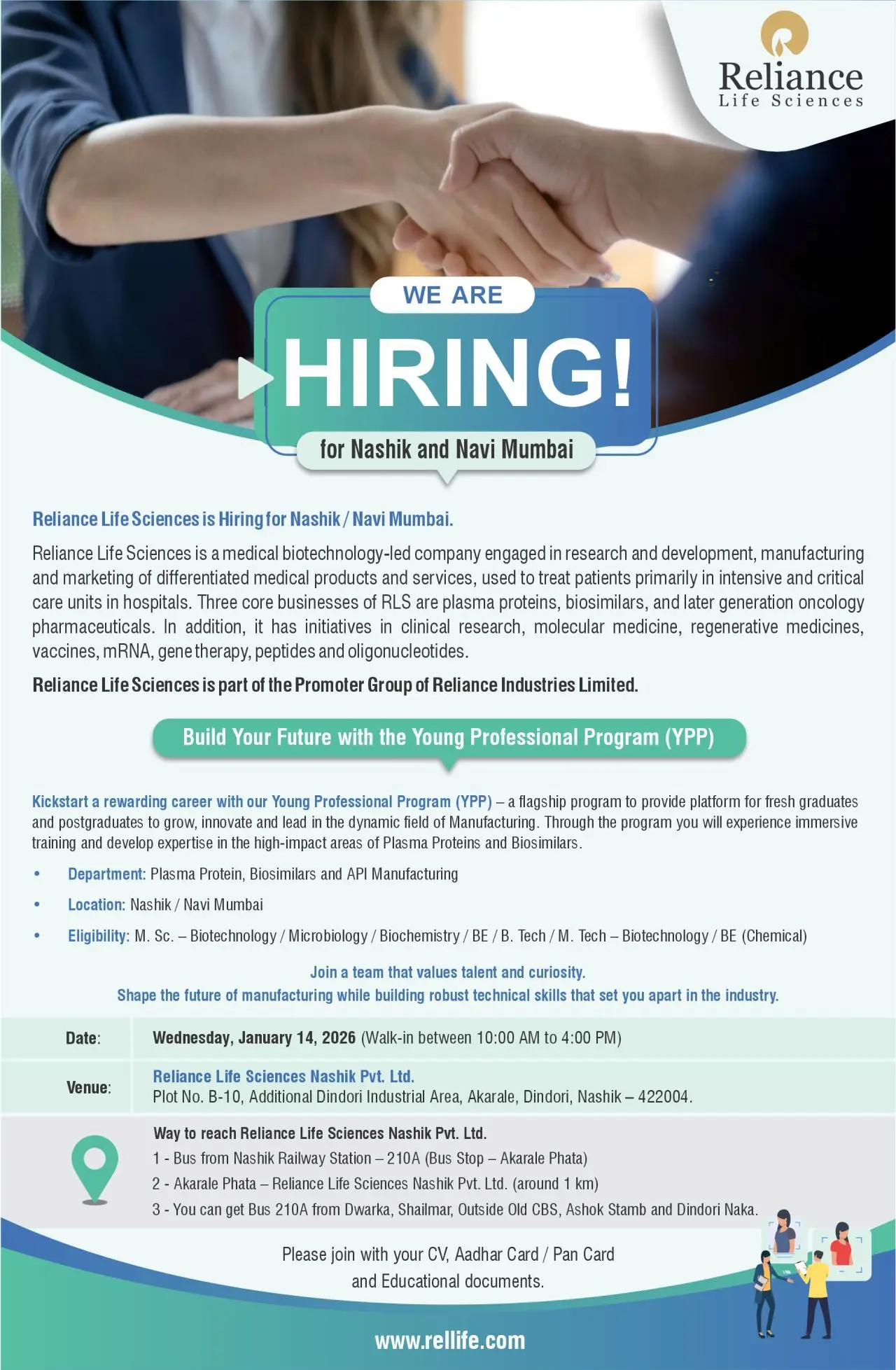 Reliance Life Sciences is inviting experienced professionals and fresh biotechnology graduates to attend a large-scale walk-in drive for its advanced biopharmaceutical manufacturing facilities in Nashik and Navi Mumbai. This hiring drive focuses on high-growth domains such as biosimilars manufacturing, plasma protein production, fill-finish operations, and structured entry through the Young Professional Program (YPP). These roles offer direct exposure to regulated biotech manufacturing, cutting-edge biologics production, and long-term career progression within one of India’s most respected life sciences organizations.