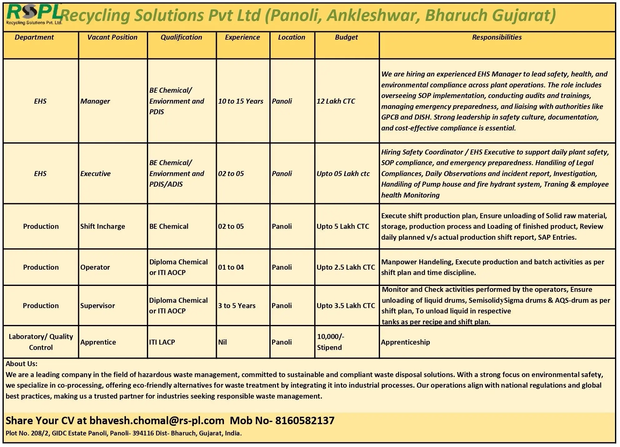 - Work Location: RSPL Recycling Solutions Pvt. Ltd., Plot No. 208/2, GIDC Estate Panoli, Bharuch, Gujarat – 394116.