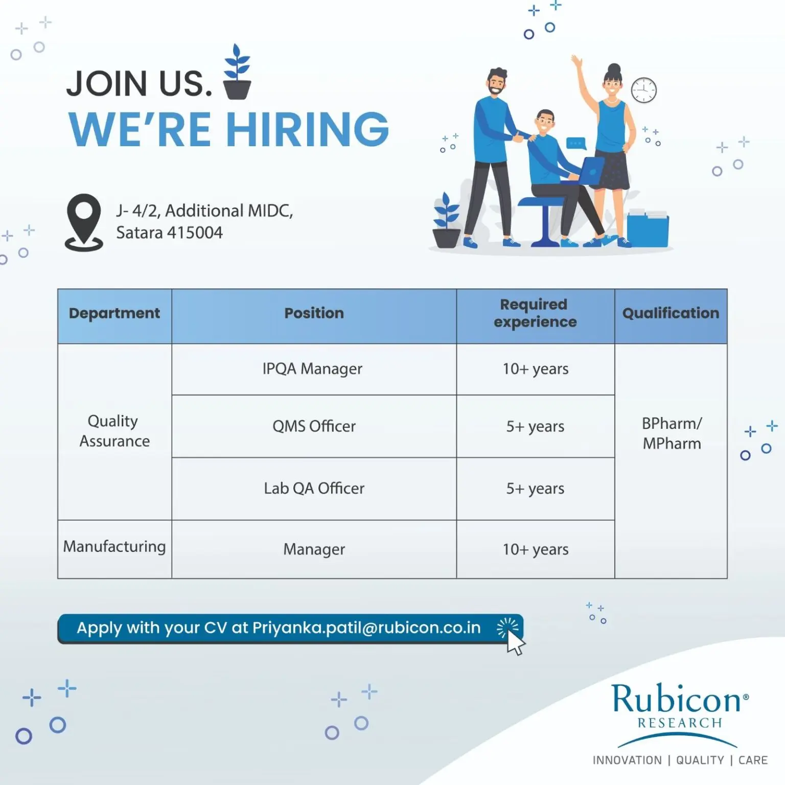 Rubicon Research is hiring experienced B.Pharm/M.Pharm professionals for QA, QMS, and Manufacturing roles at Satara. Apply now via email.