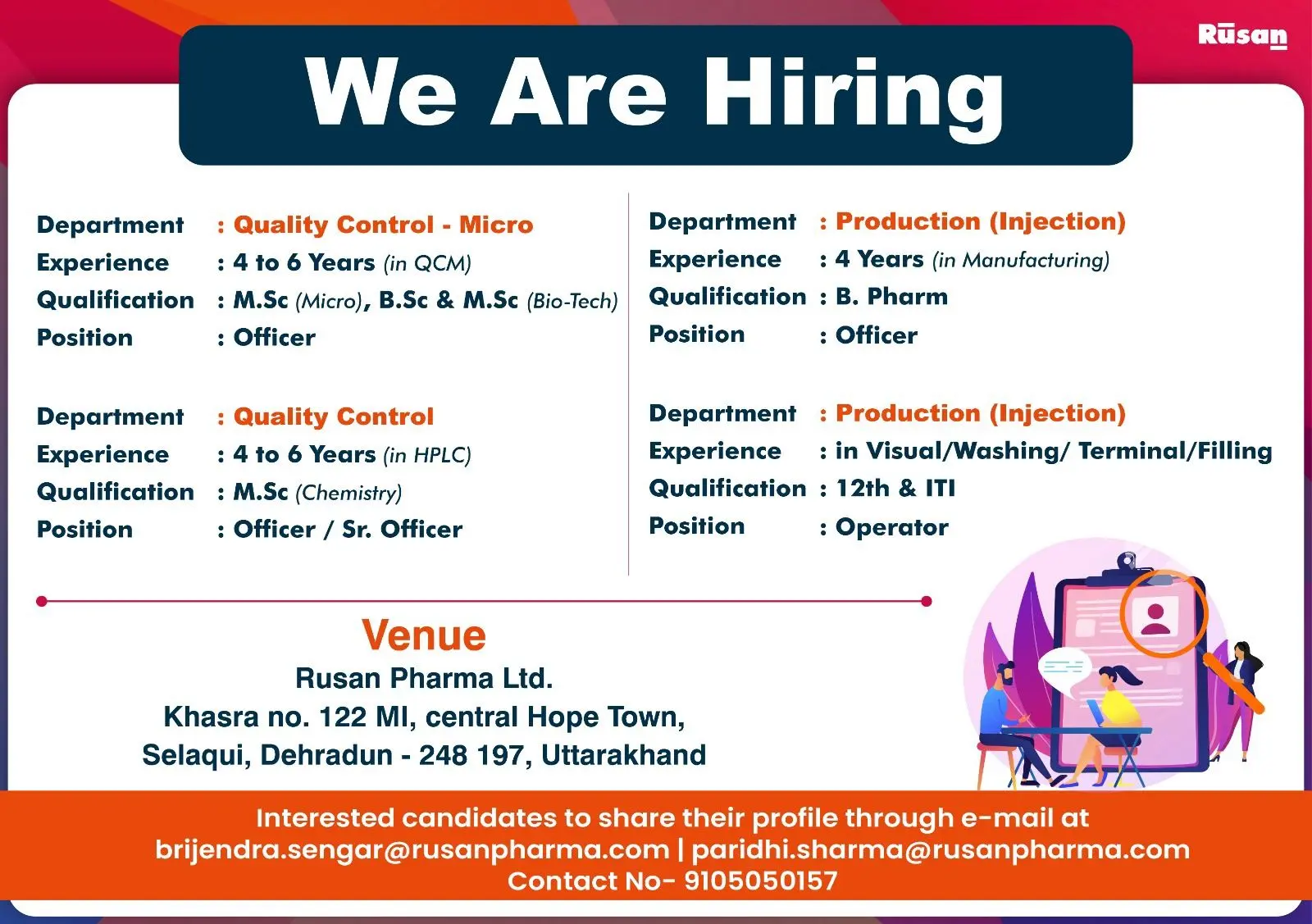 Rusan Pharma hiring QC (Micro/HPLC) and Production (Injection) officers/operators — experienced candidates (4+ yrs) in Dehradun.
