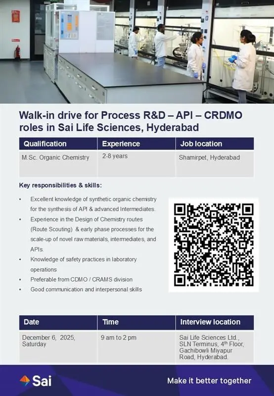 Sai Life Sciences is conducting a walk‑in drive for experienced Process R&D professionals in API development at its Hyderabad facility. These roles are ideal for candidates with strong foundations in synthetic organic chemistry, route design and early‑phase process development for CRDMO projects.