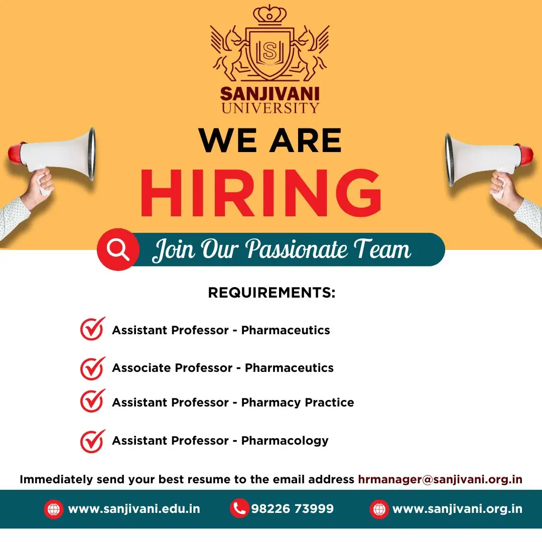 Sanjivani University is hiring qualified pharmacy faculty members to join its academic team. The institution is looking for passionate educators who can contribute to teaching, research, and academic development in Pharmaceutics, Pharmacy Practice, and Pharmacology. Candidates with strong subject knowledge, research inclination, and academic leadership are encouraged to apply.