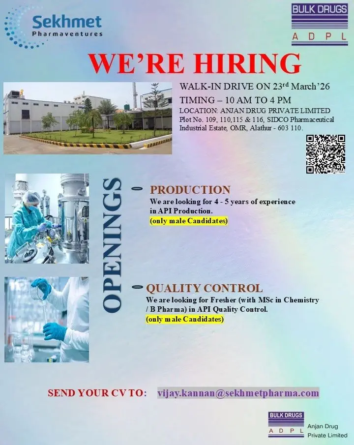Looking for a career in API manufacturing, quality control, or pharmaceutical production? Sekhmet Pharmaventures, in association with Anjan Drug Private Limited, is conducting a walk-in drive for Quality Control (QC) and Production roles at their Chennai facility.