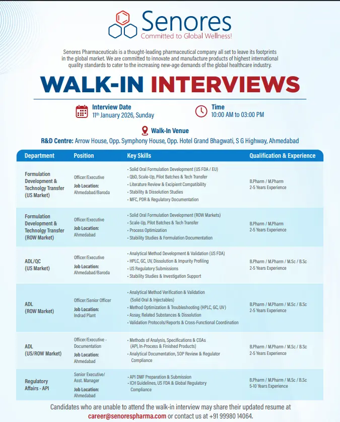 Senores Pharmaceuticals hiring R&D, ADL, QC & Regulatory professionals in Ahmedabad. B.Pharm/M.Pharm eligible. Walk-in Jan 11, 2026.