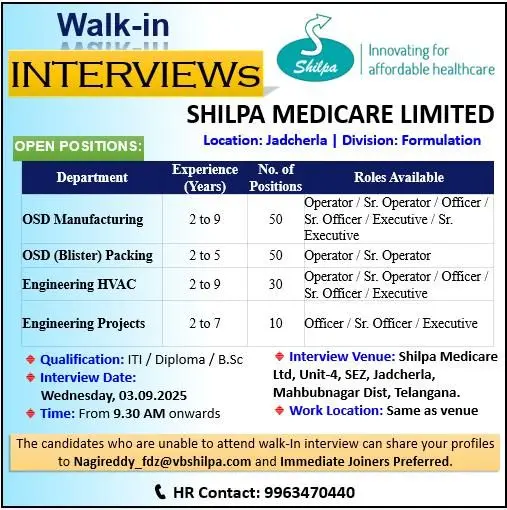OSD, Packing, Engineering Vacancies | Shilpa Medicare Walk-In Jadcherla