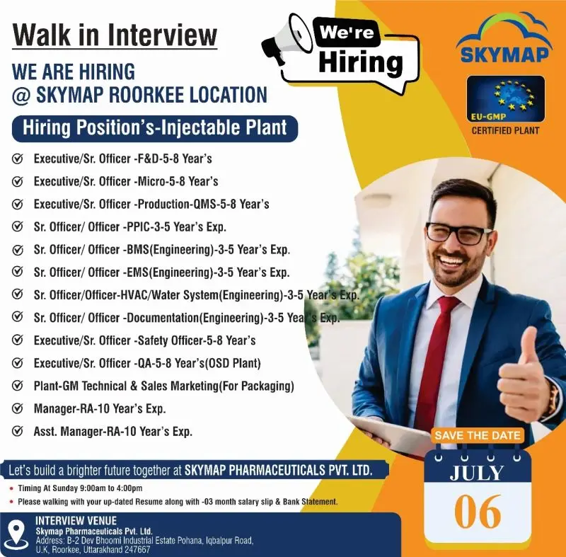 Skymap Pharmaceuticals Pvt. Ltd., a certified EU-GMP injectable plant, is conducting walk-in interviews for various roles across Quality Assurance, Formulation & Development, Microbiology, Engineering, and Regulatory Affairs departments. This is an excellent opportunity for professionals with backgrounds in B. Pharma, M. Pharma, or MSc. to join a growing team and contribute to global-standard pharmaceutical production.