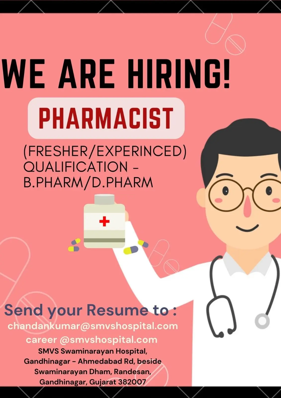 Meta Description: B.Pharm, D.Pharm freshers and experienced candidates apply for Pharmacist roles at SMVS Hospital Gandhinagar.